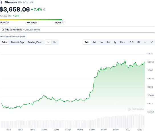 ETH: 日内涨幅7.4%。目前在各平台24h交易量总合约16.84B。现价:3,657.52