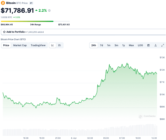 BTC: 日内涨幅2.2%。目前在各平台24h交易量总合约32.51B。现价:71,786.91