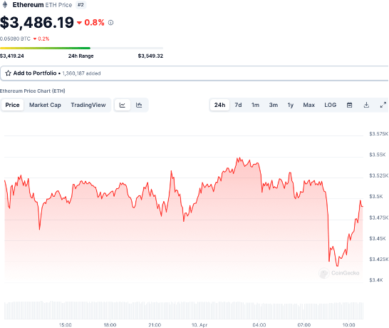ETH: 日内跌幅0.9%。目前在各平台24h交易量总合约18.23B。现价:3,486.19