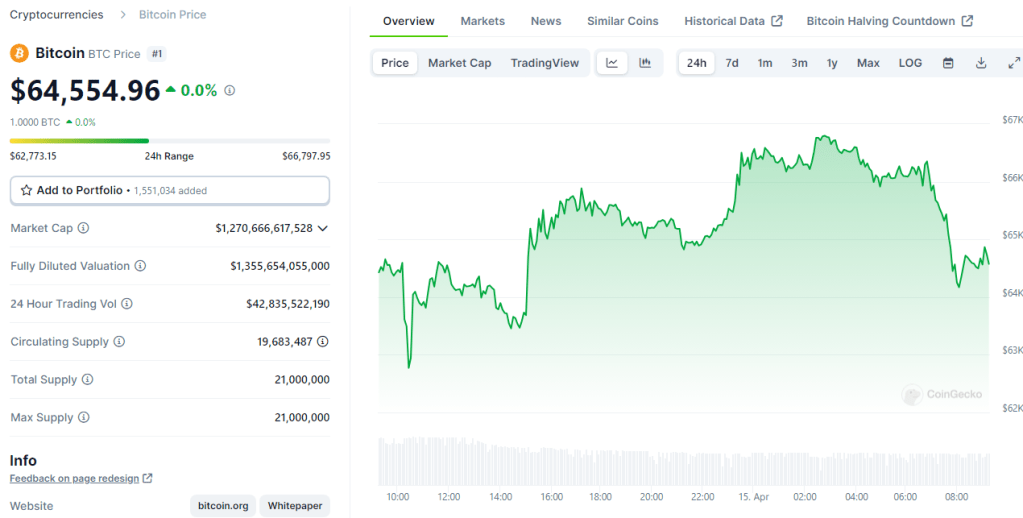 BTC: 日内持平。目前在各平台24h交易量总合约42.84B。现价:$64,554.96