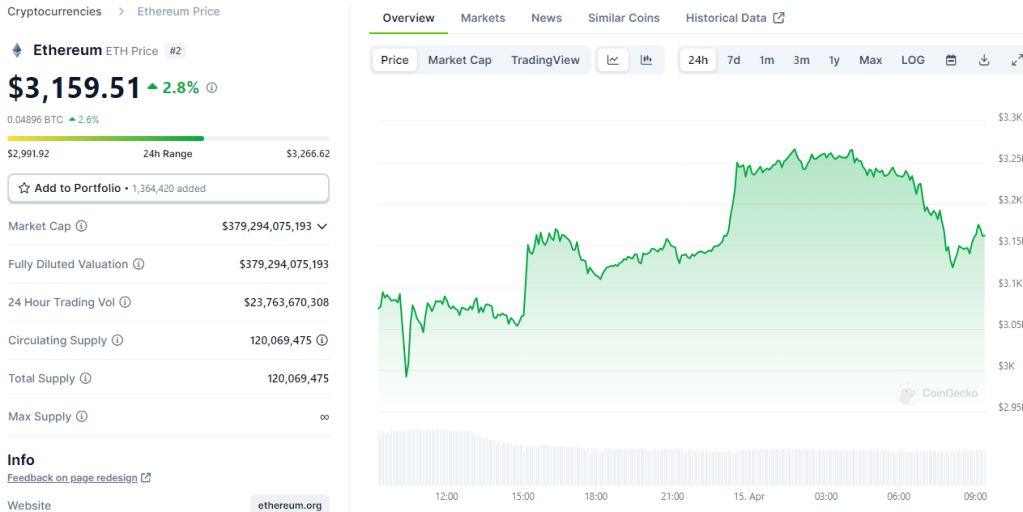 ETH: 日内增幅2.8%。目前在各平台24h交易量总合约23.78B。现价:$3,159.51