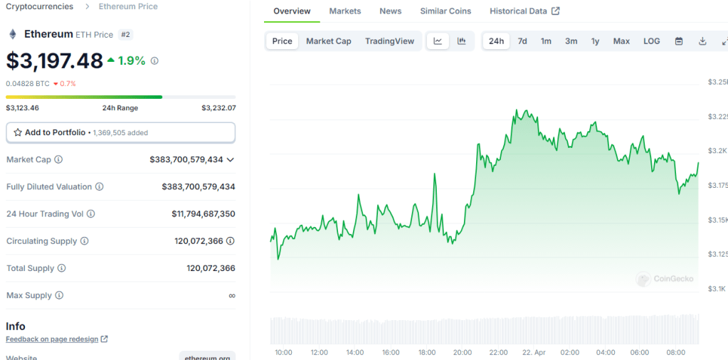 ETH: 日内涨幅1.9%。目前在各平台24h交易量总合约11.79B。现价:$3,197.48