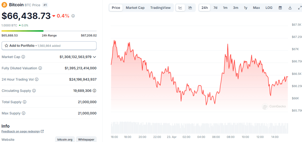 BTC: 日内涨幅0.4%。目前在各平台24h交易量总合约24.20B。现价:$66,438.73