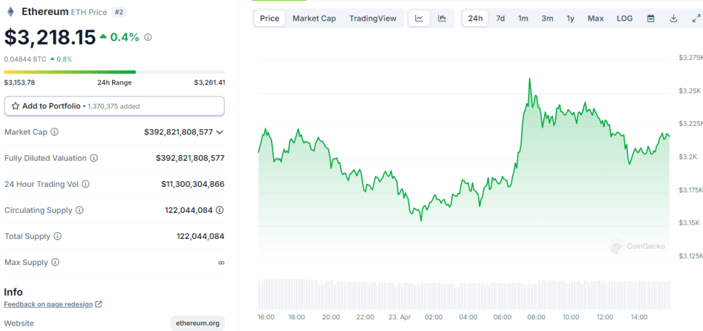 ETH: 日内涨幅0.4%。目前在各平台24h交易量总合约11.30B。现价:$3,218.15