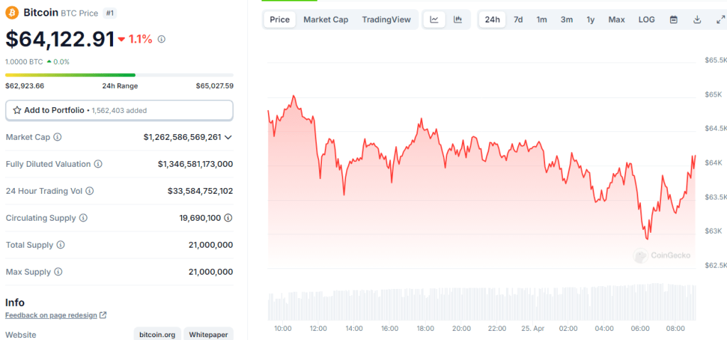BTC: 日内跌幅1.1%。目前在各平台24h交易量总合约33.58B。现价:$64,122.91