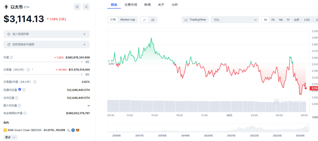 ETH: 日内跌幅1.18%。目前在各平台24h交易量总合约11.47B。现价:$3,114.13