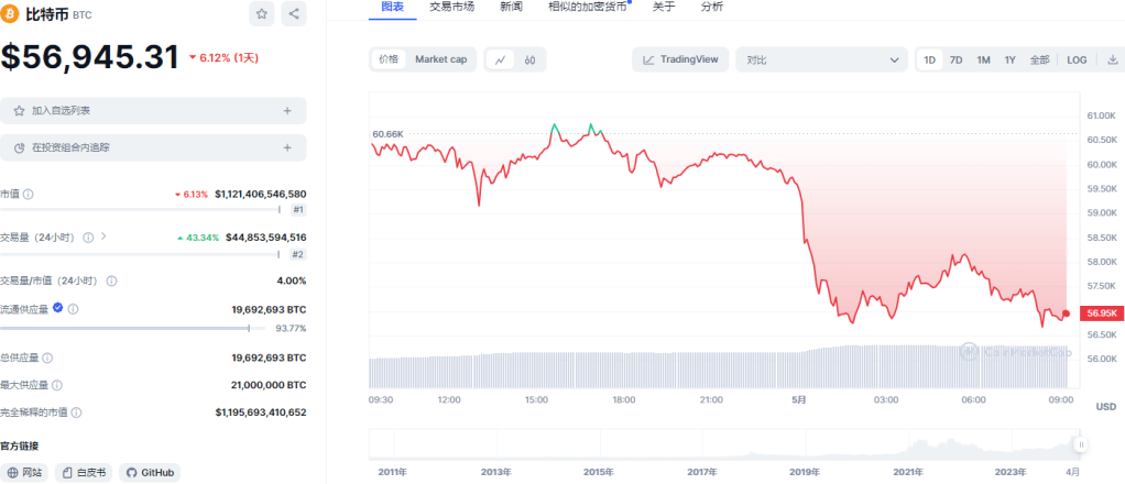BTC: 日内跌幅6.12%。目前在各平台24h交易量总合约44.85B。现价:$56,945.31