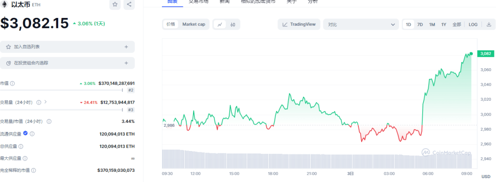 ETH: 日内涨幅3.16%。目前在各平台24h交易量总合约12.75B。现价:$3,082.15