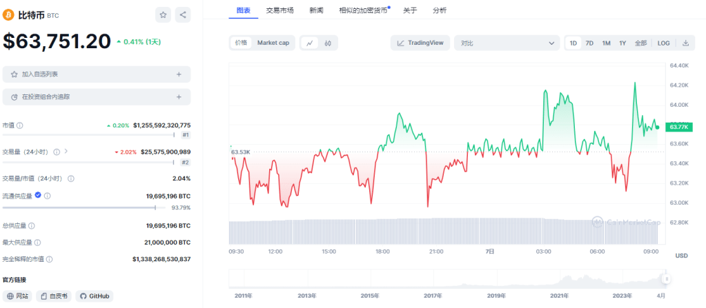 BTC: 日内涨幅0.4%。目前在各平台24h交易量总合约25,57B。现价:$63,751.20