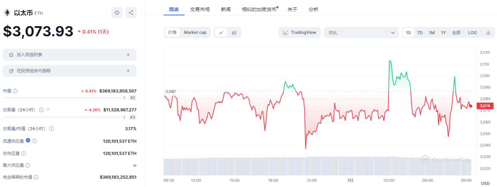 ETH: 日内涨幅0.41%。目前在各平台24h交易量总合约11,53B。现价:$3,073.93