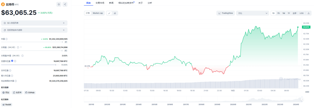BTC: 日内跌幅3.02%。目前在各平台24h交易量总合约25.31B。现价:$63,065.25