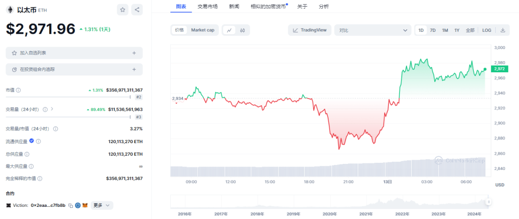 ETH: 日内跌幅1.31%。目前在各平台24h交易量总合约11.54B。现价:$2,971.96