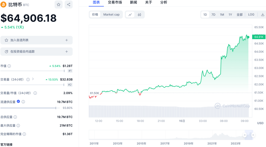 BTC: 日内跌幅5.54%。目前在各平台24h交易量总合约32.83。现价:$64,906.18