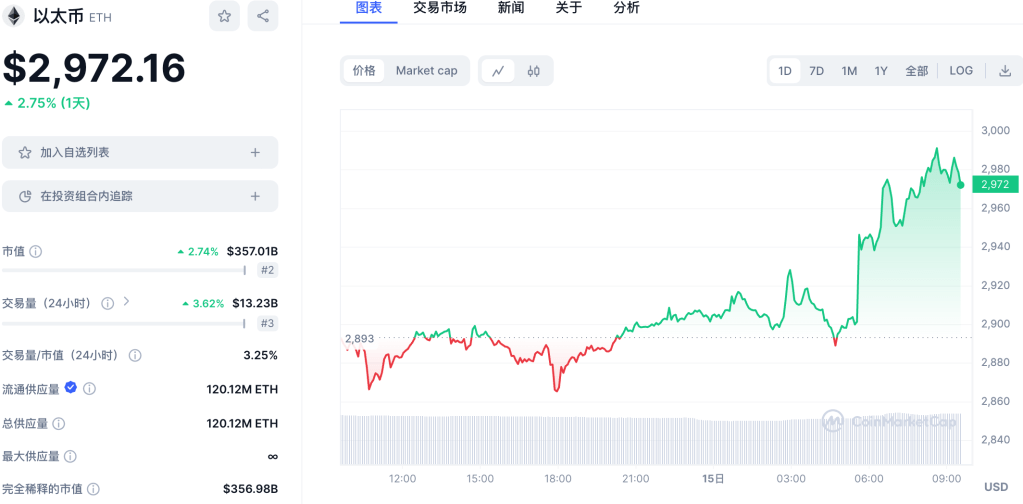 ETH: 日内跌幅2.75%。目前在各平台24h交易量总合约13.23B。现价:$2,972.16