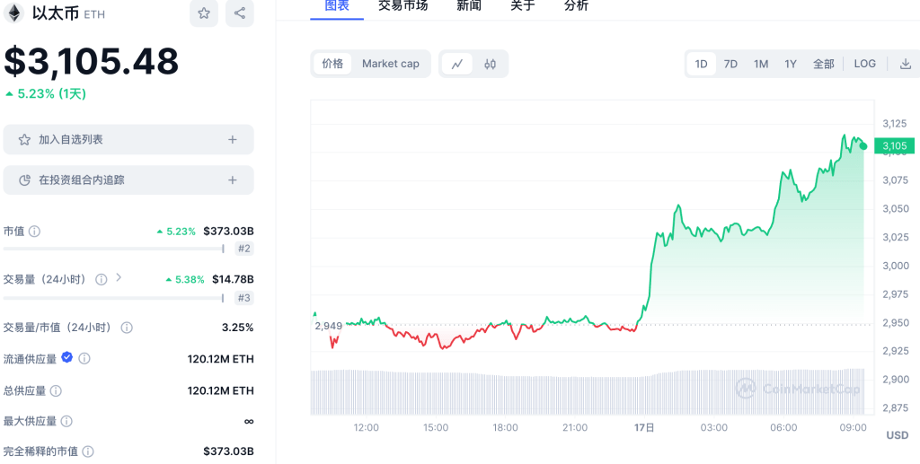 ETH: 日内涨幅5.23%。目前在各平台24h交易量总合约14.78B。现价:$3,105.48
