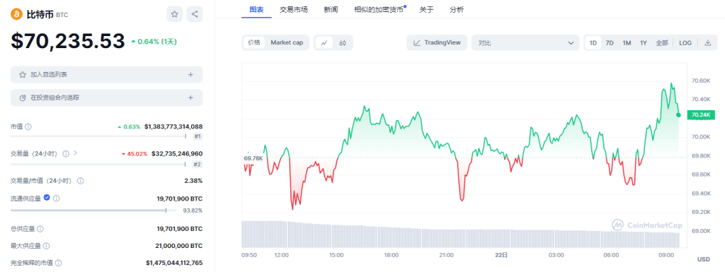 BTC: 日内涨幅0.64%。目前在各平台24h交易量总合约22.74B。现价:$70,235.53