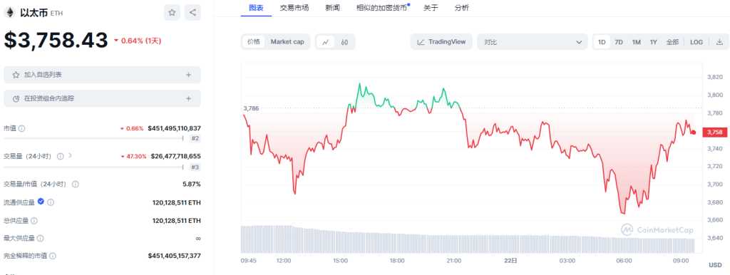 ETH: 日内跌幅0.64%。目前在各平台24h交易量总合约26.47B。现价:$3,758.43