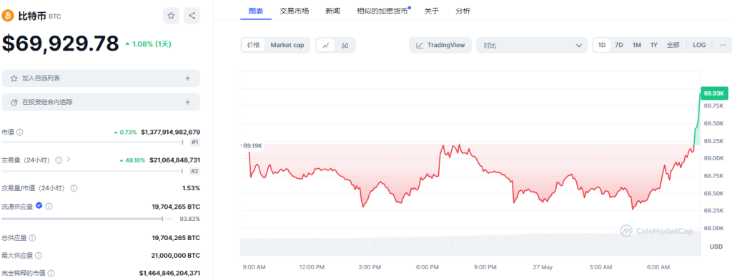 BTC: 日内涨幅1.08%。目前在各平台24h交易量总合约21.33B。现价:$69,929.78