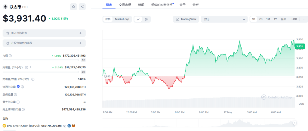 ETH: 日内涨幅1.92%。目前在各平台24h交易量总合约18.27B。现价:$3,931.40