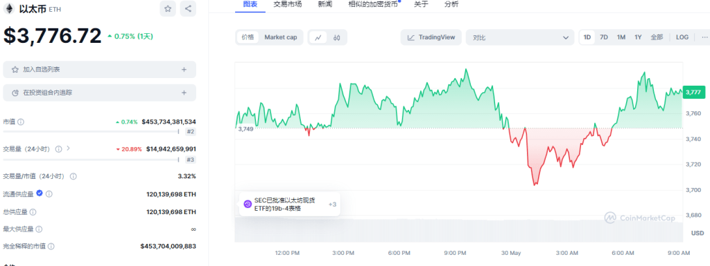 ETH: 日内涨幅0.75%。目前在各平台24h交易量总合约14.94B。现价:$3,776.72