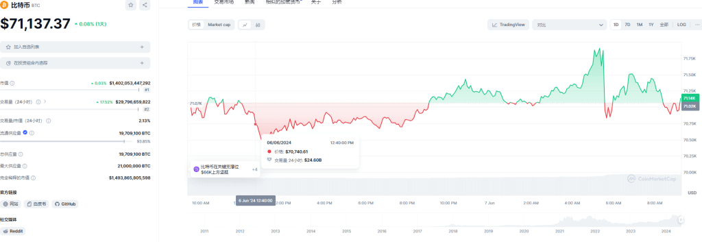 BTC: 日内涨幅0.08%。目前在各平台24h交易量总合约29.80B。现价:$71,137.37