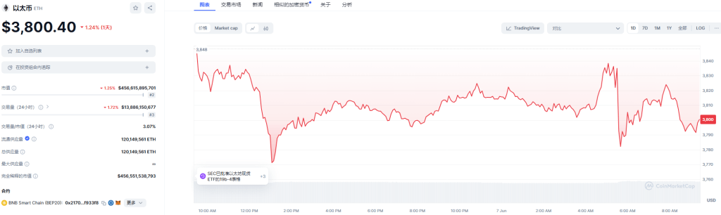 ETH: 日内跌幅1.24%。目前在各平台24h交易量总合约13.89B。现价:$3,800.40