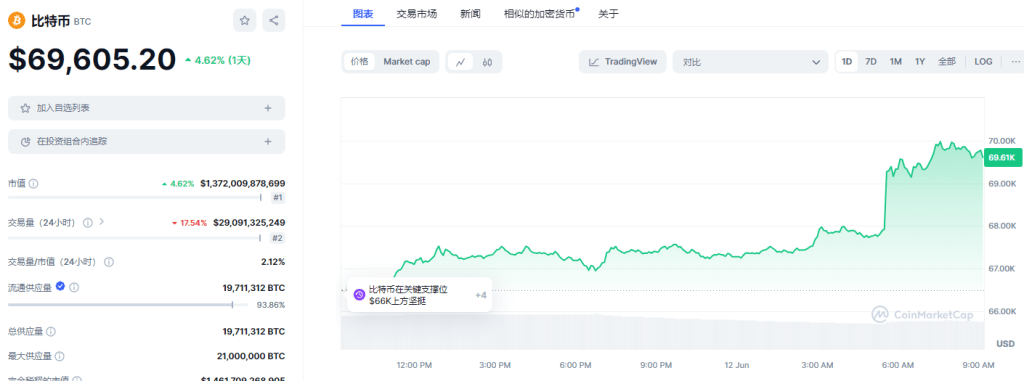 BTC: 日内涨幅4.62%。目前在各平台24h交易量总合约29.10B。现价:$69,605.20