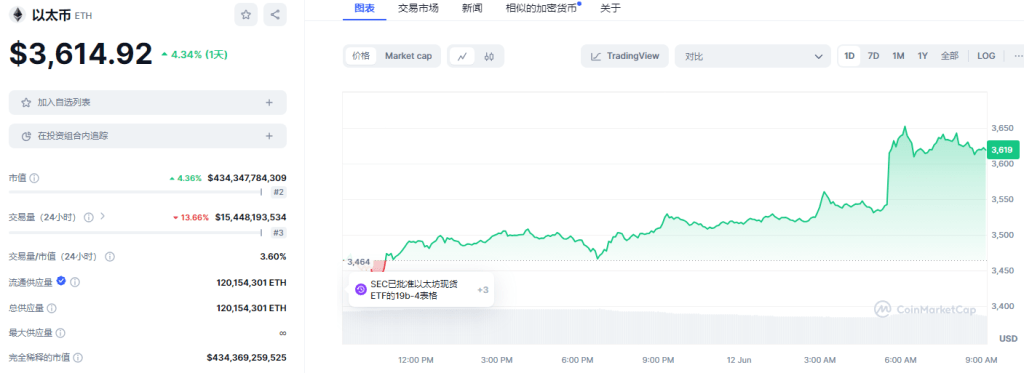 ETH: 日内涨幅4.36%。目前在各平台24h交易量总合约15.45B。现价:$3,615.07