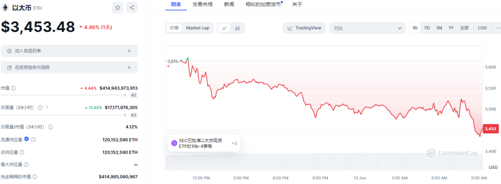 ETH: 日内涨幅4.46%。目前在各平台24h交易量总合约17.17B。现价:$3,453.48