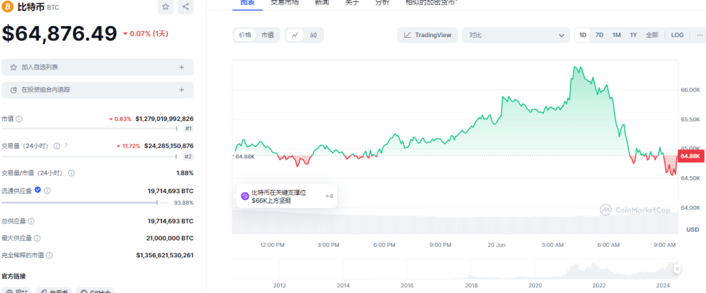 BTC: 日内跌幅0.07%。目前在各平台24h交易量总合约24,29B。现价:$64,876.49
