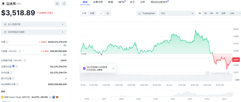 ETH: 日内跌幅0.66%。目前在各平台24h交易量总合约16.56B。现价:$3,518.89