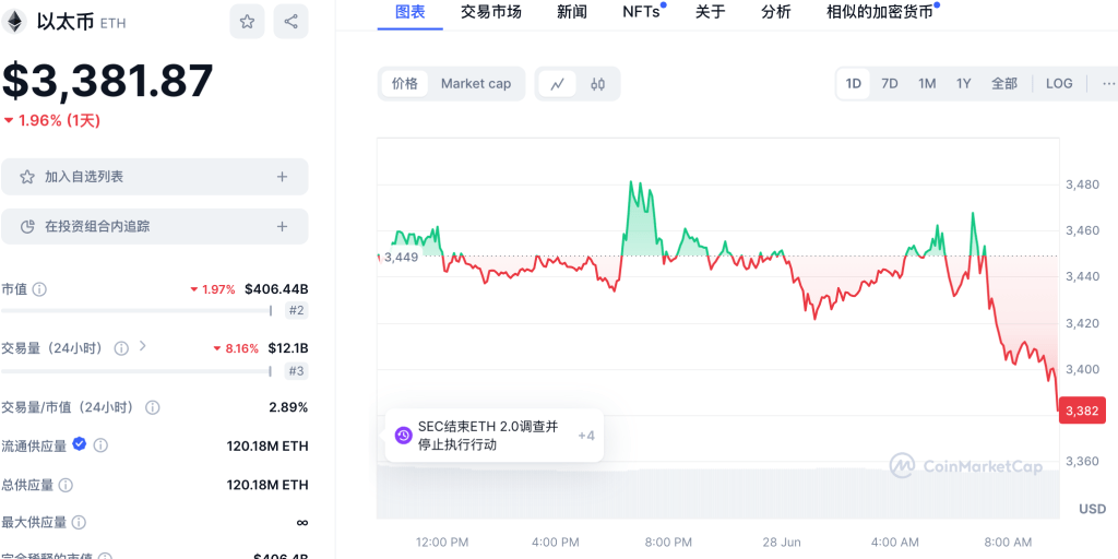 ETH: 日内跌幅1.96%。目前在各平台24h交易量总合约12.18B。现价:$3,381.87