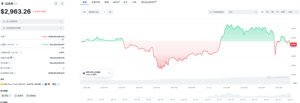 ETH: 日内跌幅0.47%。目前在各平台24h交易量总合约31.30B。现价:$2,963.26