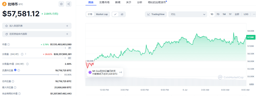 BTC: 日内涨幅2.84%。目前在各平台24h交易量总合约28.26B。现价:$57,581.12