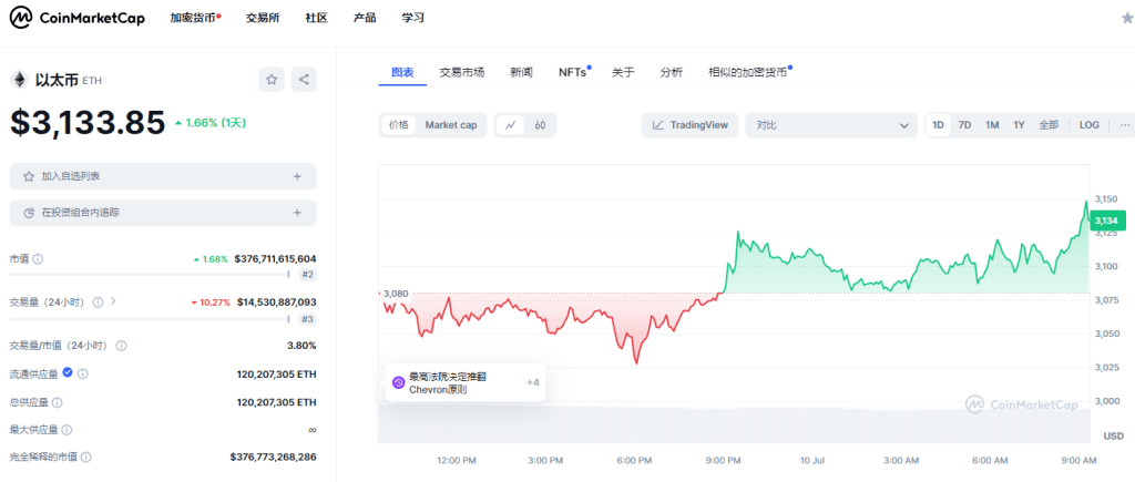 ETH: 日内涨幅1.66%。目前在各平台24h交易量总合约14.53B。现价:$3,133.85