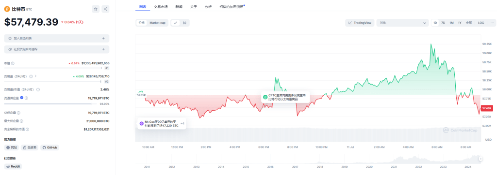 BTC: 日内跌幅0.64%。目前在各平台24h交易量总合约28.15B。现价:$57,479.39