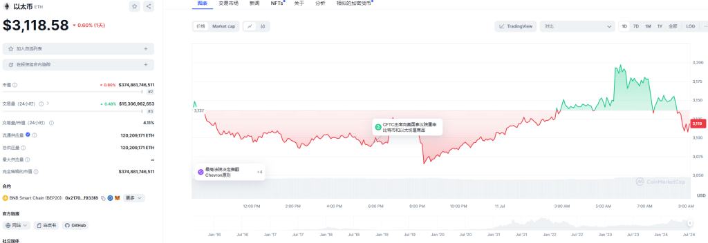 ETH: 日内跌幅0.60%。目前在各平台24h交易量总合约15.30B。现价:$3,118.58