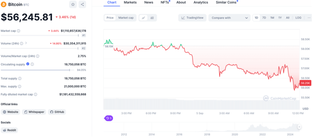 BTC: 日内跌幅3.46%。目前在各平台24h交易量总合约30.35B。现价:56,245.81