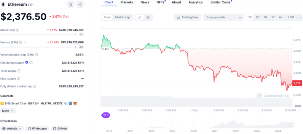 ETH: 日内跌幅3.97%。目前在各平台24h交易量总合约13.24B。现价:2,376.50