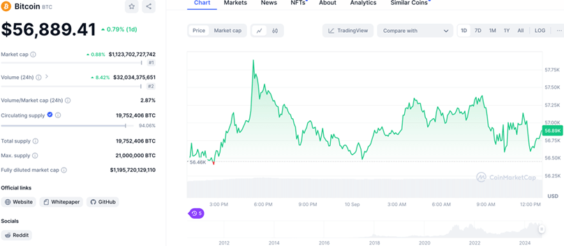 BTC: 日内涨幅0.79%。目前在各平台24h交易量总合约32.03B。现价:56,889.41