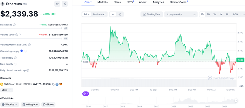 ETH: 日内涨幅0.10%。目前在各平台24h交易量总合约13.59B。现价:2,339.38